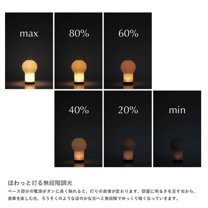 日本が誇る伝統工芸“ちょうちん”に着目し、和紙の持つ柔らかな光と質感、 LEDで実現した充電や調光の機能を掛け合わせたポータブルランプ。 “ぼんぼり“をイメージしたフォルムで、インテリアのアクセントになります。 丸みのある形状により、光をランプの上方向だけでなくテーブル面にも届けます。 ほわっと灯る無段階調光で、ベース部分の電源ボタンに長く触れると、灯りの表情が変わります。 部屋に明るさを足す光から、食事を楽しむ光、ろうそくのようなほのかな光へと無段階でゆっくり暗くなっていきます。もう一度長く触れるとゆっくり明るくなります。消灯するタイミングで直前の明るさが記憶されるので、 次に灯した時に消灯する前と同じ明るさで点灯させることができます。 ボタンはタッチセンサー式なので、軽く触れるだけで反応します。