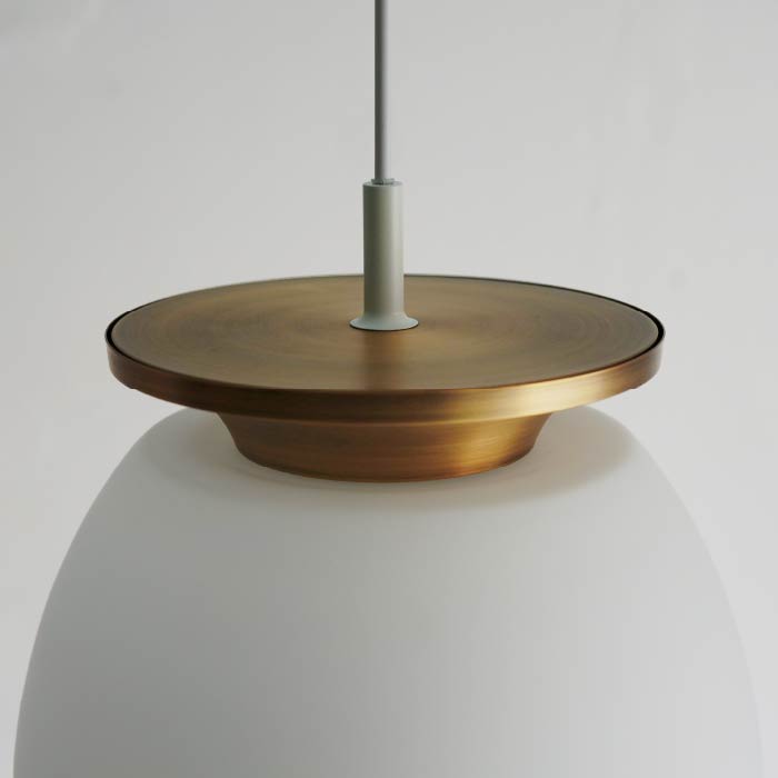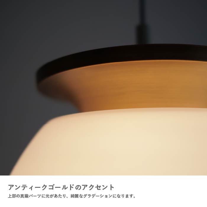 100W の明るさでダイニングやリビングのメイン照明にもお使いいただけます。北欧照明にインスピレーションを受けてデザインされたこの照明は、電球が直接見えないような設計(グレアレス設計)になっており、覗き込まない限り電球が見えないようになっています。さらに素材や形状で光がより広く拡散するフォルムとなっていて、1灯でも十分なあかりを取ることができます。上部の真鍮パーツに光があたり、アンティークゴールドのパーツが綺麗なグラデーションになります。マット加工を施したホワイトガラスシェードはさらっとした質感で高級感もあり、点灯していない時でもふんわりと柔らかな印象です。