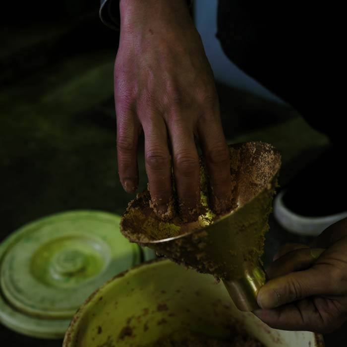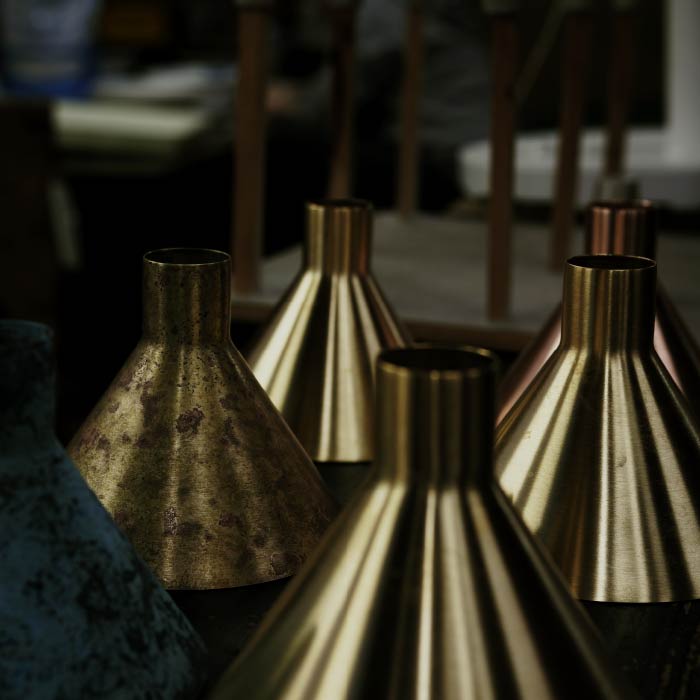 伝統技術「糠焼」や銅や真鍮が持つ腐食性を利用し、銅や真鍮の美しさを引き出したカラーリング。点灯時には内側と外側で異なる表情を楽しめます。職人が手作業で着色を施し、それぞれ異なる独自の風合いを生み出しています。