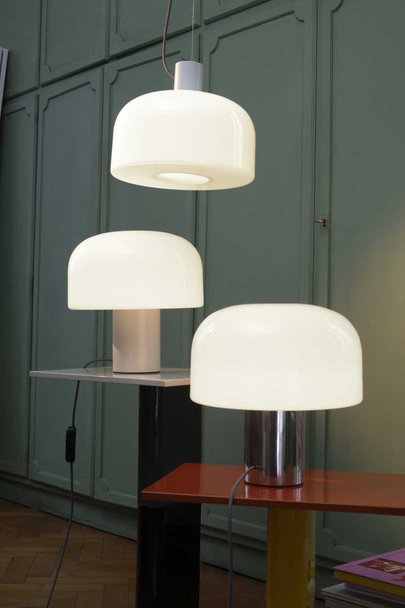 その特徴的なシェードをもとに、今回発売となる新シリーズ「Bellhop Glass」が登場しました。三層の乳白色吹きガラスを採用した大型サイズのシェードから柔らかな光を透過させることで、空間全体を照らすアンビエントライトを実現。従来モデルでは光は下向きに導びかれていますが、新モデルは空間照明としての役割を持ち、用途に応じた使い分けが可能です。